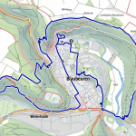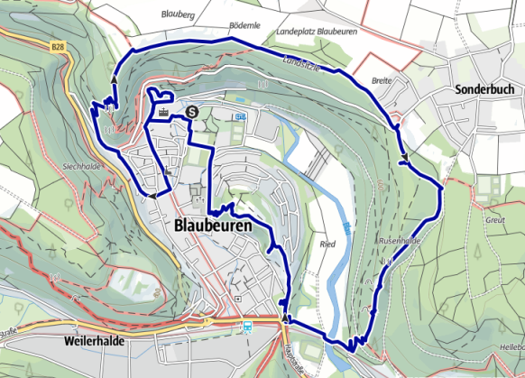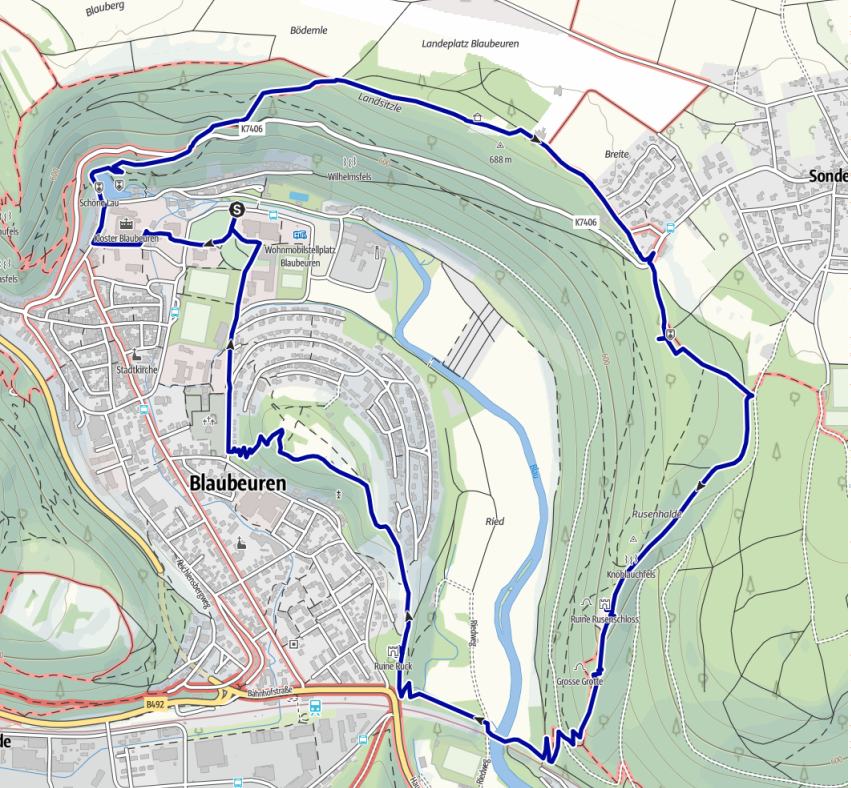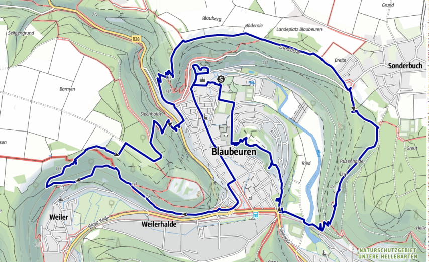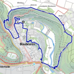 Tourverlauf: Vom Blautopf durch die Stadt und das Felsenmeer zur Ruine Günzelburg, von dieser über die Hochfläche wieder abwärts zur Stadt dann aufwärts zum Blaufelsen, weiter vorbei am Landeplatz Blaubeuren, zum Knoblauchfelsen und dem Rusenschloss, von dort hinab zur Blau, weiter zum Klötzle Blei und über den Rucken zurück.