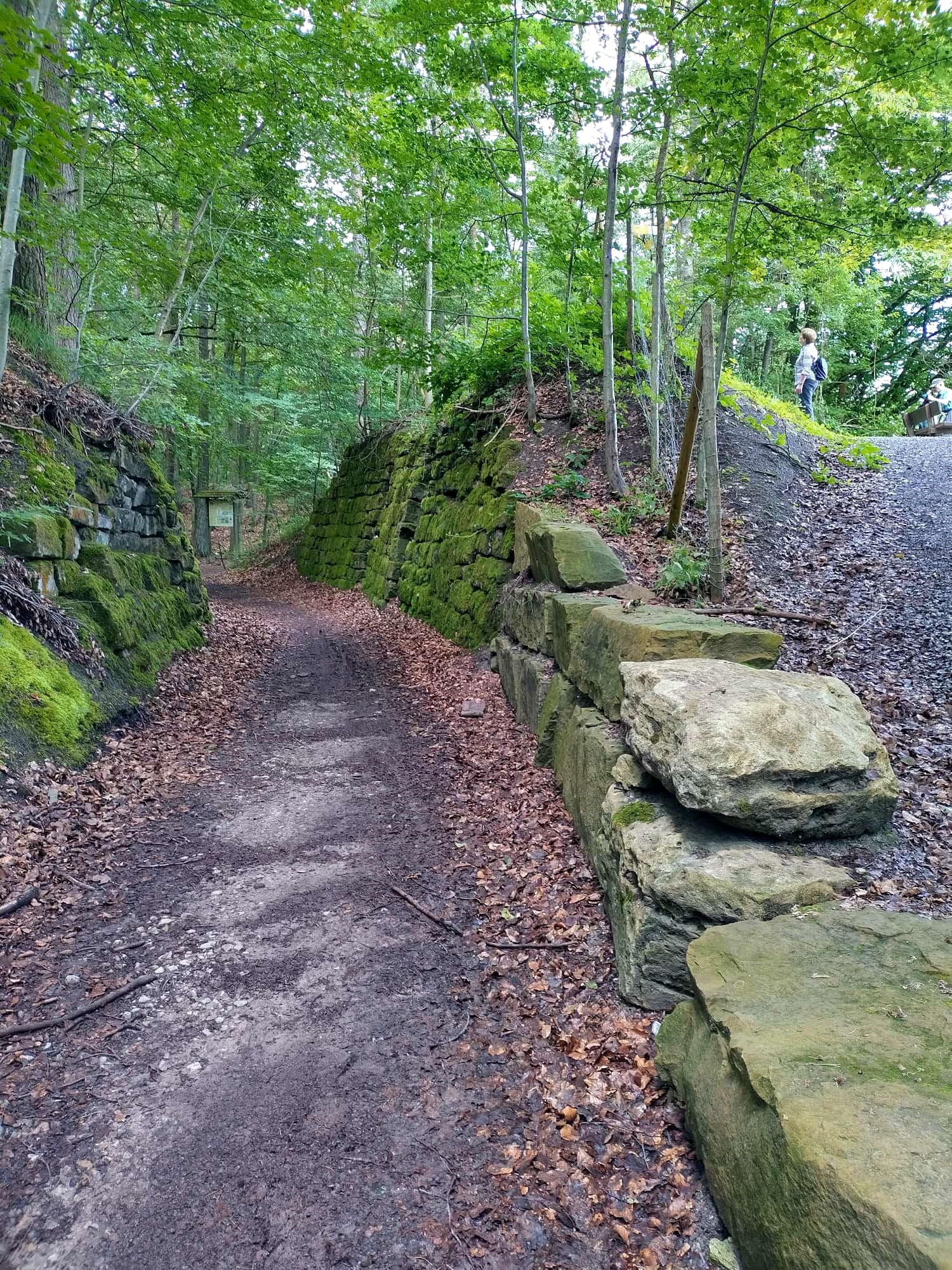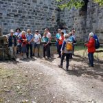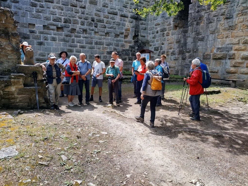 Mit dem „Stromer“, dem Rad- und Wanderbus, fuhr eine Gruppe des Schwäbischen Albvereins Bietigheim-Bissingen nach Häfnerhaslach, um eine Teilstrecke auf dem Sachenheimer Weg zu wandern. Dieser Weg verbindet alle Ortsteile von Sachsenheim, ist insgesamt ca. 30 km lang und wurde bereits 1979 der Öffentlichkeit übergeben.  Man wähnte sich schon während der Fahrt durch die herrliche Landschaft des  Kirbachtales im Urlaub.  Am Dorfbrunnen in Häfnerhaslach begann die ca. 10 km lange Wanderung nach Ochsenbach. Es ging zunächst auf einem schmalen Pfad steil bergauf zum idyllisch gelegenen Heiligenbergsee, einem Rückhaltebecken und Fischgewässer. Bei idealem Wanderwetter führte der Weg auf dem Rennweg durch den Wald, vorbei an der Brandholzhütte. Einer Abzweigung folgend wanderte die Gruppe zum „Weißen Steinbruch“, seit 1986 als Naturdenkmal ausgewiesen. Von 1902 bis 1914 diente er zum Abbau von Stubensandstein. Bekannt wurde er durch seine Funde von Fossilien. Kein anderer Steinbruch im Keuper weist einen solchen Reichtum an Funden auf,  die bis etwa 220 Millionen Jahre zurückreichen. Mit einem weiten Blick von der Aussichtsplattform ins Zabergäu und nach einer verdienten Mittagsrast setzte die Gruppe ihre Wanderung auf dem Rennweg fort und erreichte einen Abzweig zur Ruine Blankenhorn. Hier fand an diesem Sonntag ein Gottesdienst „Kirche im Grünen“ mit Bewirtung statt und manch einer nutzte die Gelegenheit, um sich mit einem Kuchen oder kühlen Getränk zu stärken. Die Burg wurde vermutlich um 1220/30 durch die Herren von Neuffen erbaut und hatte eine strategische Bedeutung am Rennweg. Der Minnesänger Gottfried von Neuffen lebte bis zu seinem Tod im Jahre 1270 auf der Burg Blankenhorn. Er schwärmt in seinen Liedern von der Schönheit der Natur, vom Frühling, vom Sommer, von Blümelin und von Vögelin. Der größte Teil der Wanderung lag nun hinter der Gruppe, es hieß jetzt hinabzusteigen durch Weinberge und Wiesen nach dem Weinort Ochsenbach. Hier fand die Schlusseinkehr statt, bevor der „Stromer“ die Gruppe wieder zurück nach Bietigheim brachte.