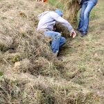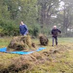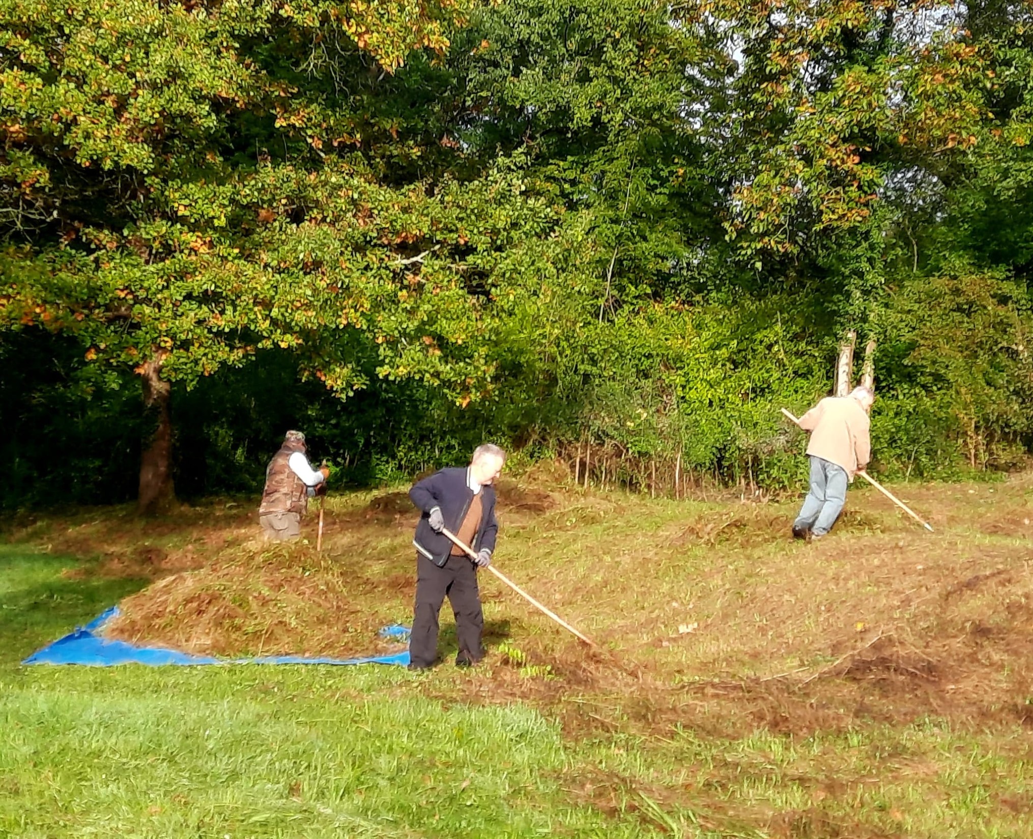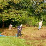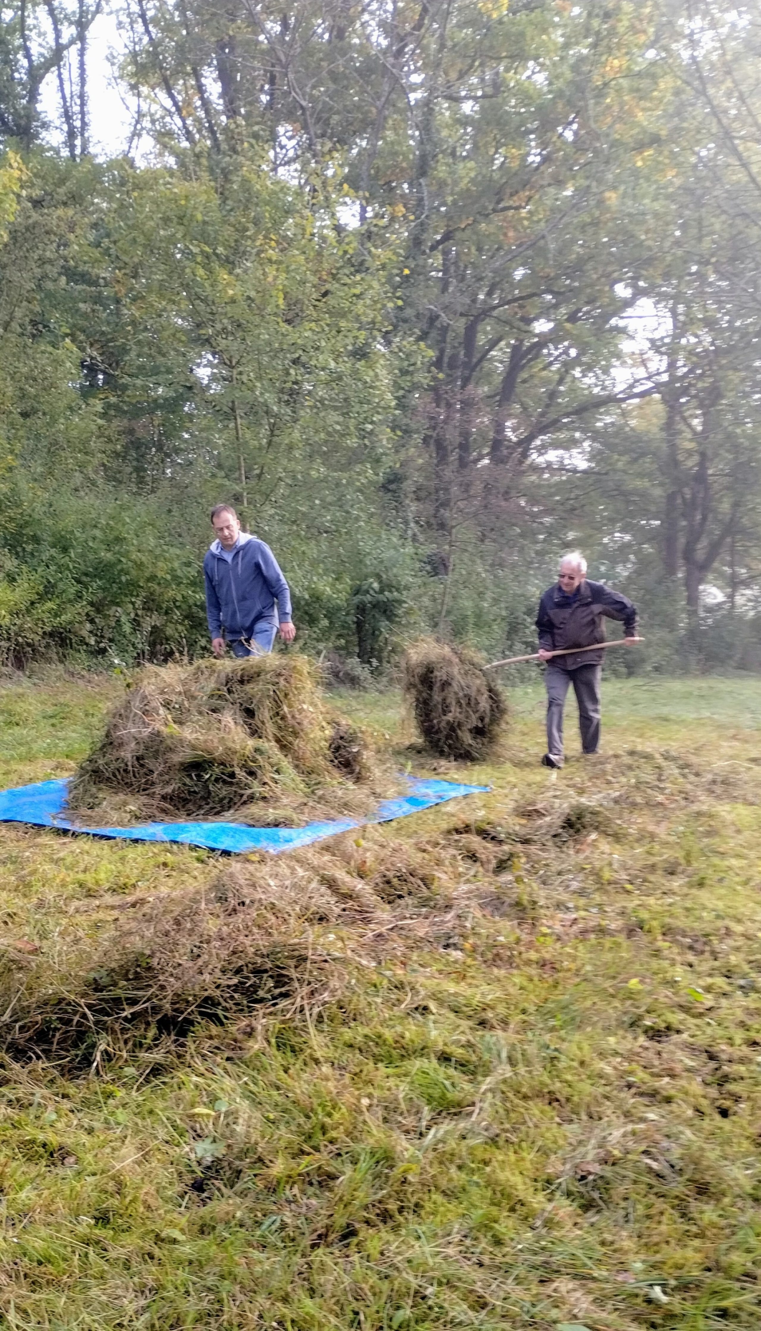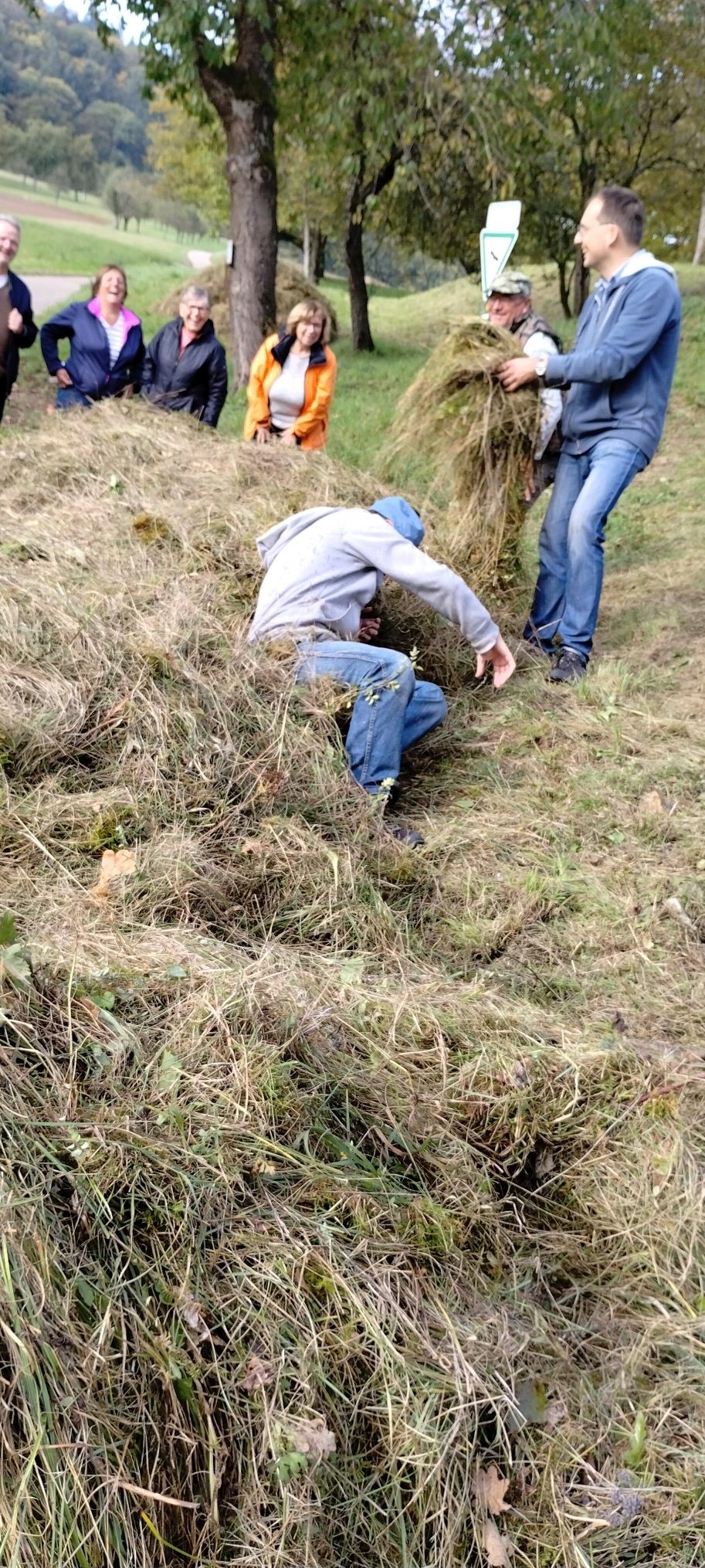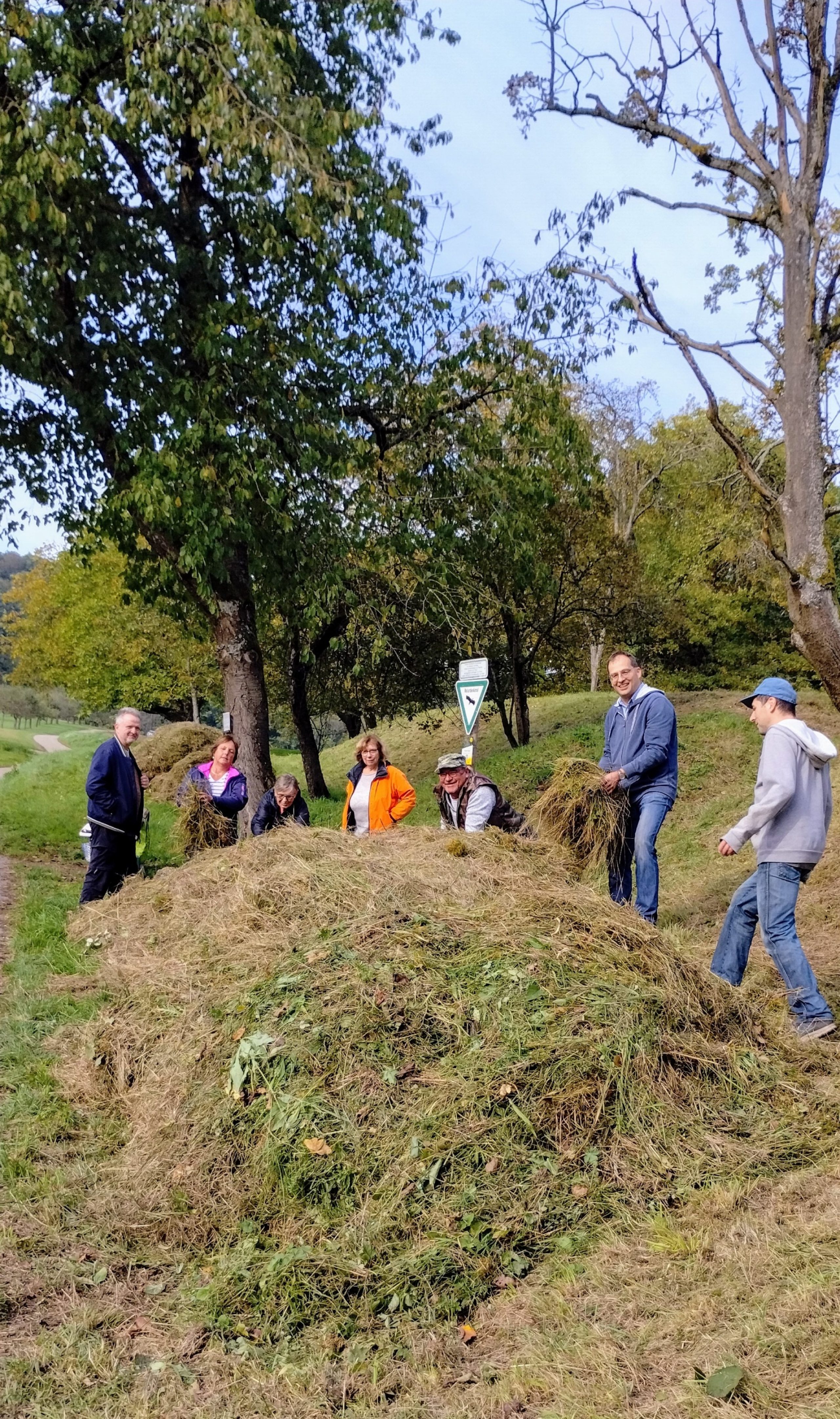 Bei schönstem Herbstwetter trafen sich 10 fleißige Helfer und Helferinnen am Hirschberg zum Naturpflegeeinsatz. Auf der 38 ar großen, ziemlich abschüssigen Halbtrockenrasenfläche, die seit 1983 als Naturdenkmal „Pflanzenstandort Hirschberg“ ausgewiesen ist, musste das von einem Landwirt vorab gemähte Mähgut zum Abtransport neben dem Weg bereitgestellt werden. Mit Heurechen und -gabeln wurde das Mähgut zusammmengerecht und auf große Plastikplanen gepackt. Diese wurden zum Weg gezogen, wo sich bald mehrere große Haufen aneinanderreihten. In den folgenden Tagen wird das Mähgut von Mitarbeitenden des städtischen Betriebshof abgeholt.