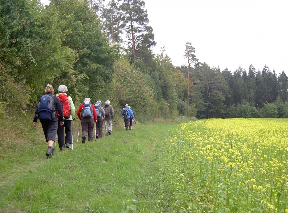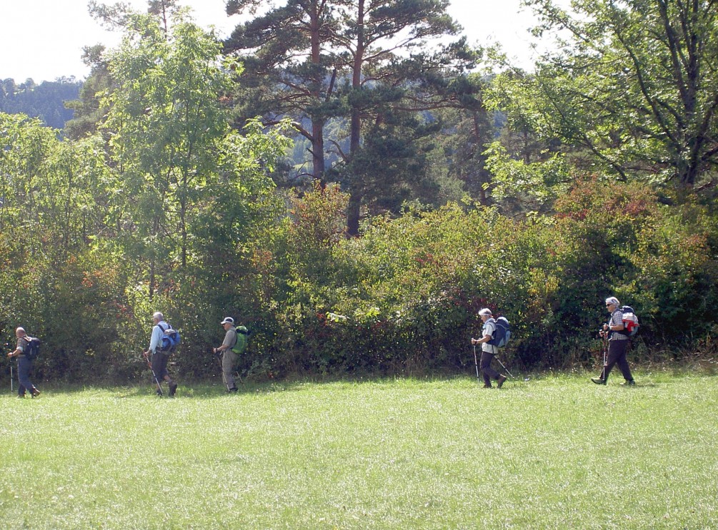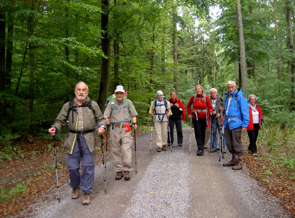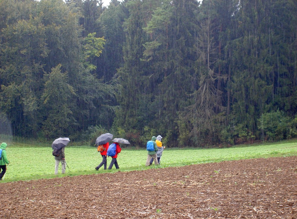 Leider meinte es der Wettergott am nächsten Tag nicht gut mit den Wanderfreunden, es regnete fast den ganzen Tag, was der guten Stimmung jedoch keinen Abbruch tat. An der Nahtstelle zwischen dem Schwarzwald-Ostrand und dem Heckengäu führte die reizvolle Strecke abwechselnd zwischen den Muschelkalkböden des Heckengäus und den roten Buntsandsteinböden des Schwarzwaldes durch einige Naturschutzgebiete zunächst nach Haiterbach, der südlichsten Gemeinde des Kreises Calw. Das Ziel an diesem Tag war Salzstetten, einem Ortsteil von Waldachtal, das bereits im Kreis Freudenstadt liegt.