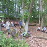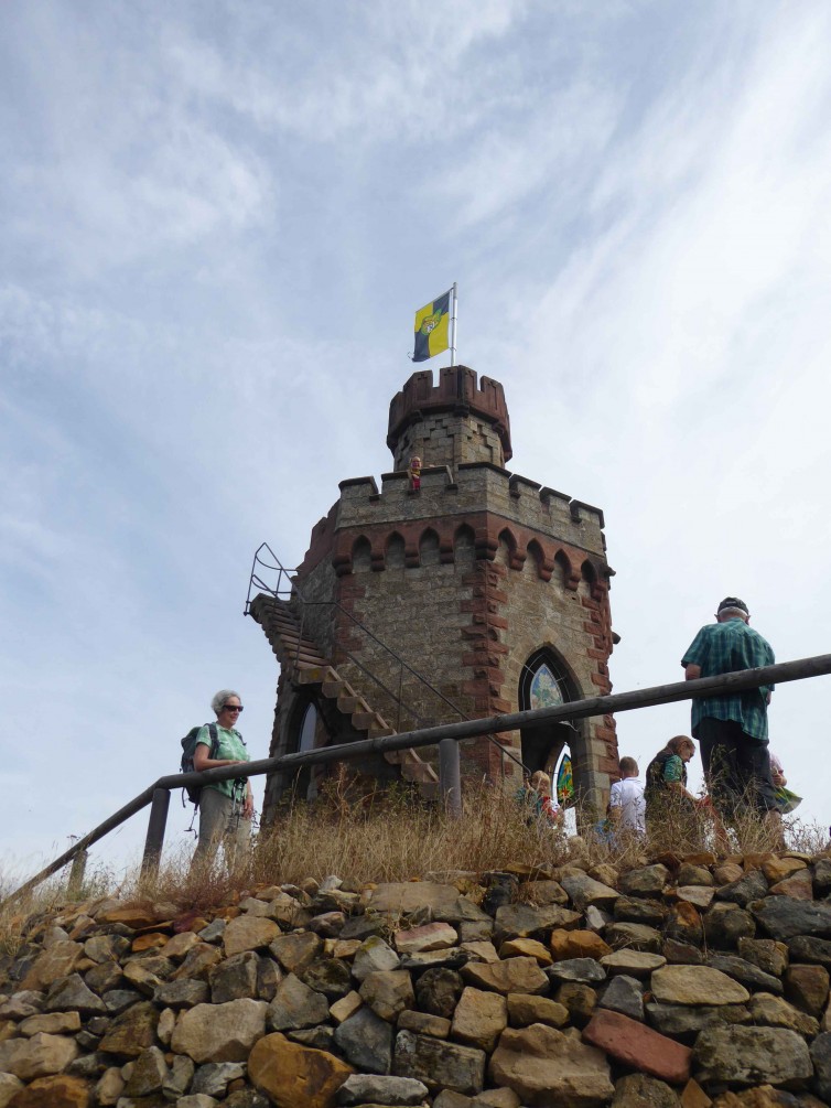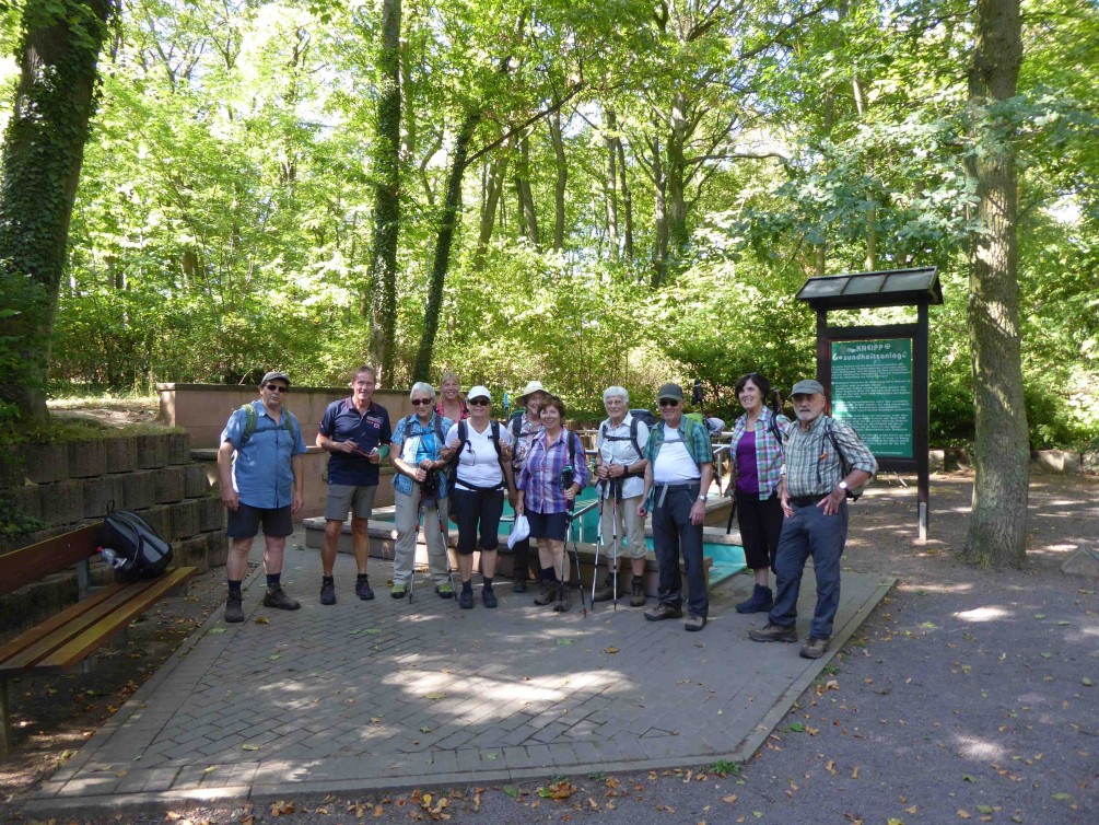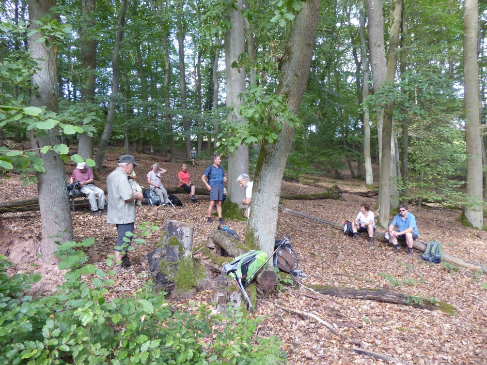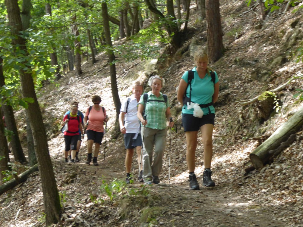 2. Tag: Der Frühstückraum lag auf der 8. Etage des Hotels, so konnte die Gruppe neben dem Frühstück auch die Sicht entlang der Höhen des Pfälzer Waldes genießen, bevor es mit Bahn und Bus zum Ausgangspunkt, der Haltestelle unterhalb Battenbergs ging. Die heutige Wegstrecke führte überwiegend durch Waldgebiet, was jedoch auf Grund der hohen Temperatur sehr willkommen war. Immer wieder boten sich zur Abwechslung auch Blicke in die Landschaft. Auf halber Strecke lag eine typische Pfälzerwald Vereinshütte, die gerne für eine Zwischeneinkehr aufgesucht wurde. Vorbei am Bismarckturm, dem Teufelsstein, einem ehemaligen germanischen Kultplatz, der Kaiser-Wilhelms Höhe mit Sicht zur Hardenburg wurde nun der über Bad Dürkheim liegende Krimhildenstuhl, ein ehemaliger römischer Steinbruch, erreicht. Von unten drang der Trubel des gerade stattfindenden Wurstmarktes, ein seit dem Jahr 1417 stattfindenden Weinfestes, herauf. Hinab ging es nun zur Schlusseinkehr nahe des Festgeländes, zu der sich die Gruppe regelrecht durchkämpfen musste. Bei guter Bewirtung und netter Unterhaltung verging die Zeit allzu schnell. Die Bahn brachte die Gruppe wieder nach Neustadt zurück, und sie ließ den Tag mit einem Besuch in der Hotelbar ausklingen.