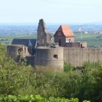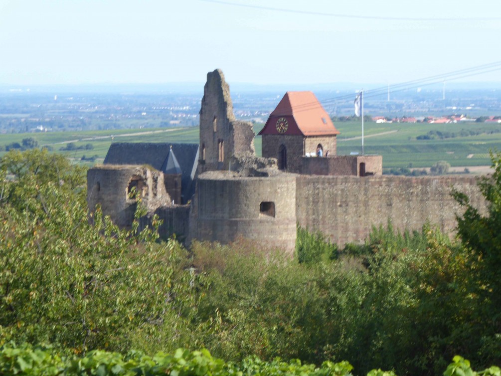 Der Weg führte die Gruppe nun über Wiesen- und Hohlwege auf die Höhe, von wo sich ein weiter Blick über die Rheinebene hinweg zum Odenwald bot. Diese Ausblicke sollten die Gruppe auch in den nächsten Tagen stets begleiten. In dem über Grünstadt gelegenen Stadtpark wurde auf der Terrasse eines Lokals eine längere Rast eingelegt, um im Zeitplan zu bleiben. Nach dem leiblichen Wohl bot sich eine Kneippanlage an, noch etwas für die Gesundheit zu tun. Erfrischt wurde nun über Höhen nach Neulingen weitermarschiert. Bald lag der auf einem Bergsporn liegende Ort mit seiner aus dem 13. Jh. stammenden Burg im Blick. Durch verwinkelte Gässchen, mit herrlichen Fachwerkhäusern, ging es nun zur Schlusseinkehr. Hier genoss die Gruppe den Abend mit Sicht in die Rheinebene bei Pfälzer Gerichten und Wein, bevor es mit Bus und Bahn nach Neustadt zurückging.
