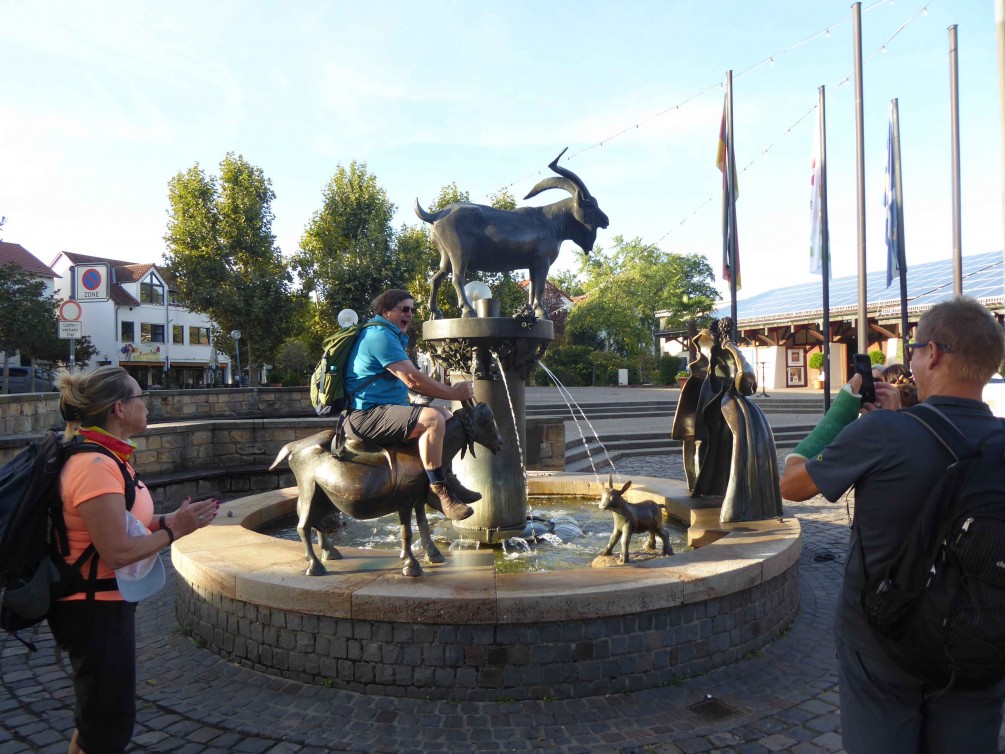 4. Tag: Nach dem Frühstück wurde zuerst das Gepäck an der Hotelrezeption abgestellt, denn anschließend an die Wanderung und Einkehr war die Rückfahrt nach Bietigheim vorgesehen. Mit dem Zug ging es nach Deidesheim, um die Wanderung fortzusetzen. Zwei Teilnehmer legten einen Ruhetag ein und nutzten diesen dazu, die sehr interessante Innenstadt Neustadts zu erkunden. In Deidesheim angekommen führte der Weg wiederum am Geißbockbrunnen vorbei, durch die Ortsmitte entlang des Weinbachs und durch Weinberge aufwärts zum Aussichtspunkt Pfalzblick am Rande des Haardtwaldes. Von hier konnte die Weinlese mit einem Vollernter beobachtet werden. Weiter führte der Weg durch Wald, überwiegend mit Edelkastanien, Keschde, wie sie die Pfälzer nennen, ins Klausental. Von dort ging es den Kirchberg aufwärts und gleich darauf wieder über einen schmalen Pfad abwärts nach Königsbach. Hier wurde eine im Schatten der Kirche liegende Gartenmauer als Rastplatz genutzt. Gestärkt und ausgeruht marschierte die Gruppe an der Hangkante oberhalb der Weinberge nun in Richtung Gimmeldingen weiter. Nochmal war ein Anstieg zu einem Aussichtspunkt am Plattenberg zu bewältigen. Eine kurze Rast wurde eingelegt, bei der sich über Gimmeldingen und Mußbach hinweg ein weiter Blick in die Rheinebene bot. Von hier führte der Weg jetzt abwärts ins schattige Tal des Mußbachs, welcher etwas Kühle ausstrahlte. Diesem folgte die Gruppe aufwärts zur Looganlage (aus dem Althoch-deutschen – Lag, Log, Loog = Grenze) zwischen zwei Herrschaftsgebieten. Im am Bach gelegenen Gasthaus Benjental wurde nochmals eine längere Rast gehalten. Gestärkt und ausgeruht ging es nun 350 Höhenmeter am Loosenbrunnen vorbei aufwärts zum Weinbiet, dem höchsten Punkt der Wandertage. Da die Gruppe gut in der Zeit lag und für den Rückweg eine Kürzung geplant war, konnte hier bei einer Pfälzerwald Vereinshütte nochmals eine längere Rast gehalten werden. Der eine oder andere gönnte sich ein Weinschorle im Dubbeglas. Der Überlieferung nach wurde das Dubbeglas von Metzgern erfunden, da bei Schlachtfesten die zuvor üblichen glatten Stangengläser zu leicht aus der fettigen oder feuchten Hand rutschten. Fast in der Direttissima führte der Weg die Gruppe hinab in Richtung Neustadt. An der Scheffelwarte wurde nochmals kurz Halt gemacht, bevor es über die Dr.-Welsch-Terrasse, von welcher sich ein besonders schöner Blick auf Neustadt bot, nach Haardt zur Schlusseinkehr weiterging. Hier trafen auch pünktlich die beiden Teilnehmer, die sich den Ruhetag gönnten, ein, um zusammen nochmals zum Abschluss Pfälzer Gastlichkeit zu genießen. Von der Schlusseinkehr waren es nochmal 10 Minuten zu Fuß, vorbei an herrschaftlichen Villen in parkähnlichen Gärten zum Hotel. Dort wurde das Gepäck abgeholt und der Bus brachte die Gruppe zum Bahnhof Neustadt. Mit der Bahn ging es über Karlsruhe und weiter mit Umleitung über Bruchsal nach Vaihingen/Enz. Hier musste die Gruppe allerdings 30 Minuten Wartezeit in Kauf nehmen, bis die Fahrt nach Bietigheim fortgesetzt werden konnte. Spät abends, aber pünktlich in Bietigheim angekommen, nahmen erlebnisreiche schöne Wandertage ihr Ende.