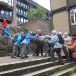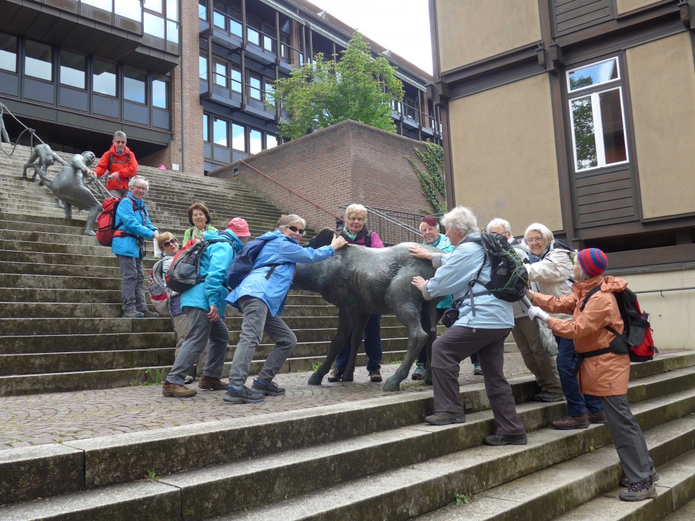 Bereits zum 13. Mal findet jährlich eine mehrtägige Frauenwanderung des Schwäbischen Albvereins Bietigheim statt, die dieses Jahr in die ehemalige freie Reichsstadt Schwäbisch Hall führte. Direkt am Marktplatz, dem Herzstück der Stadt mit prächtigen Renaissancehäusern, befand sich das Hotel, in einem der ältesten Fachwerkhäuser der Stadt. Leider konnte der Begrüßungstrunk wegen des Regens nicht auf der berühmten Treppe stattfinden und musste ins Zimmer verlegt werden. Dann machte sich die Gruppe auch schon zur ersten Wanderung „Durch die Haller Klingen“ auf. Idyllisch am Wettbach entlang führte der Weg unter der Teuchelsbrücke hindurch, einem Wasserviadukt aus dem Jahr 1580. Er war früher Teil der städtischen Wasserversorgung. Stetig ansteigend wanderten die Teilnehmerinnen die Wettbachklinge hoch. Obwohl die Regenschirme immer wieder zum Einsatz kamen, tat dies der guten Stimmung keinen Abbruch. Nach dem Besuch eines Cafés, in dem enorme Kuchenstücke serviert wurden, klang der Abend beim Nachtessen im Hotel aus.