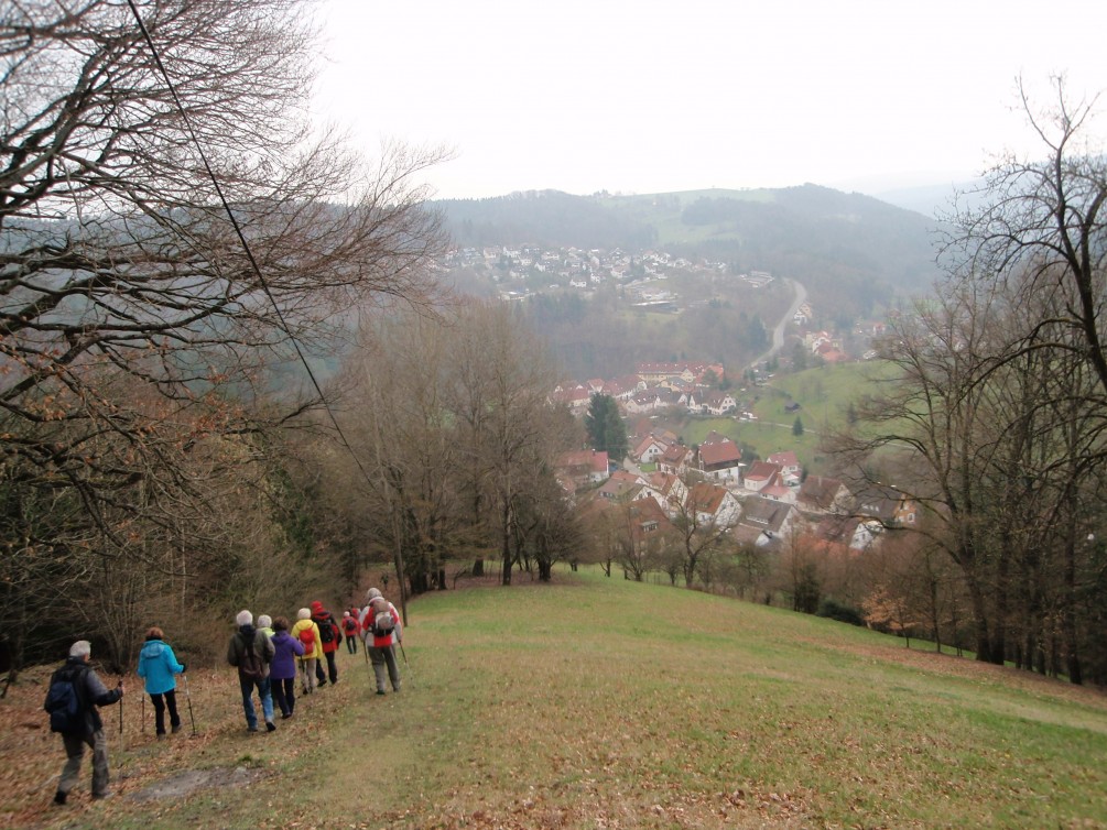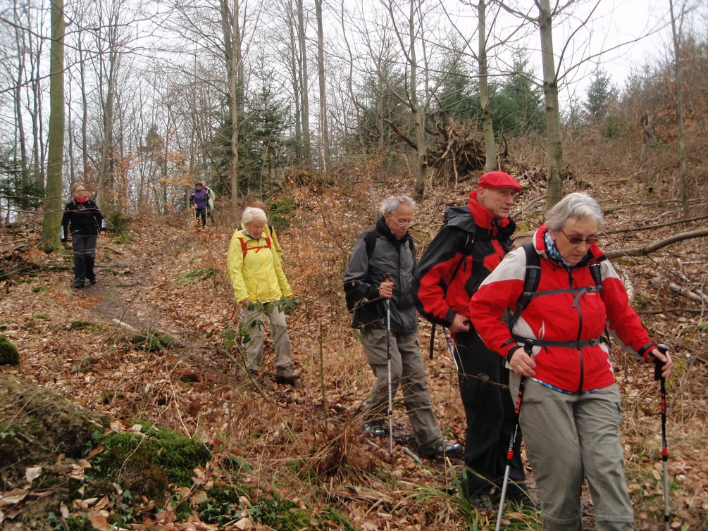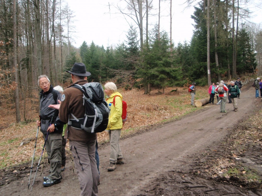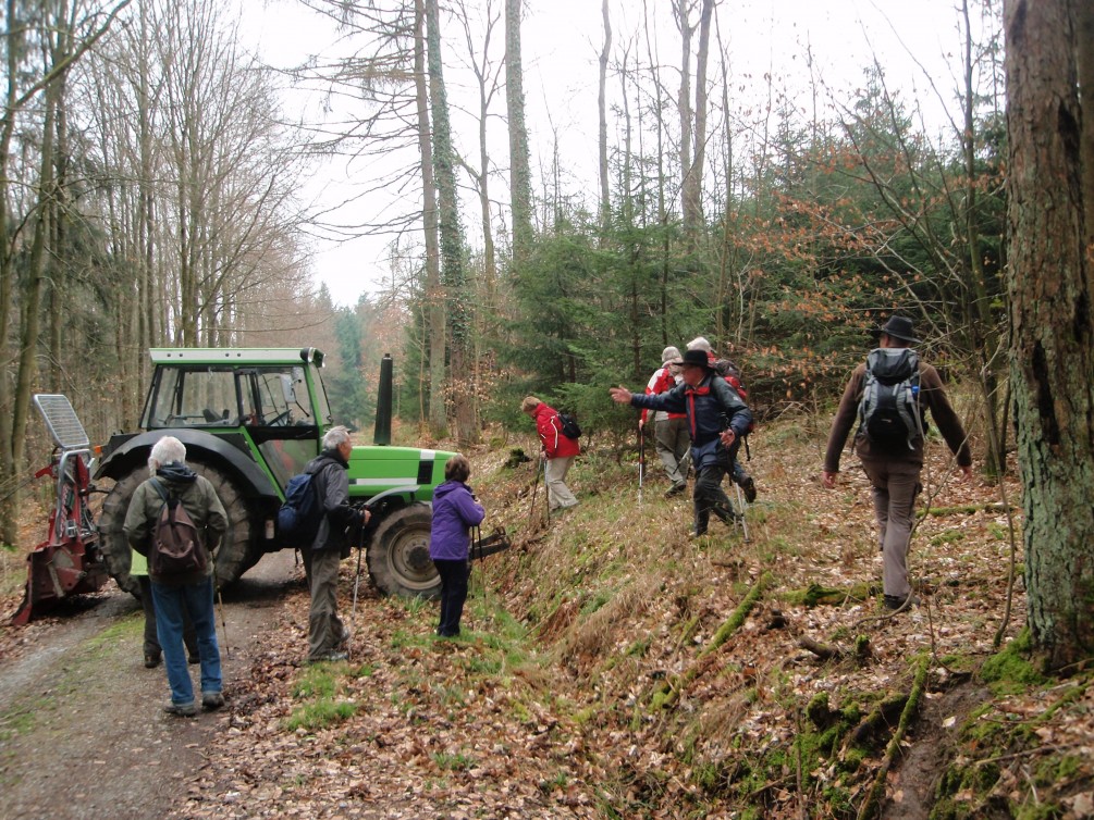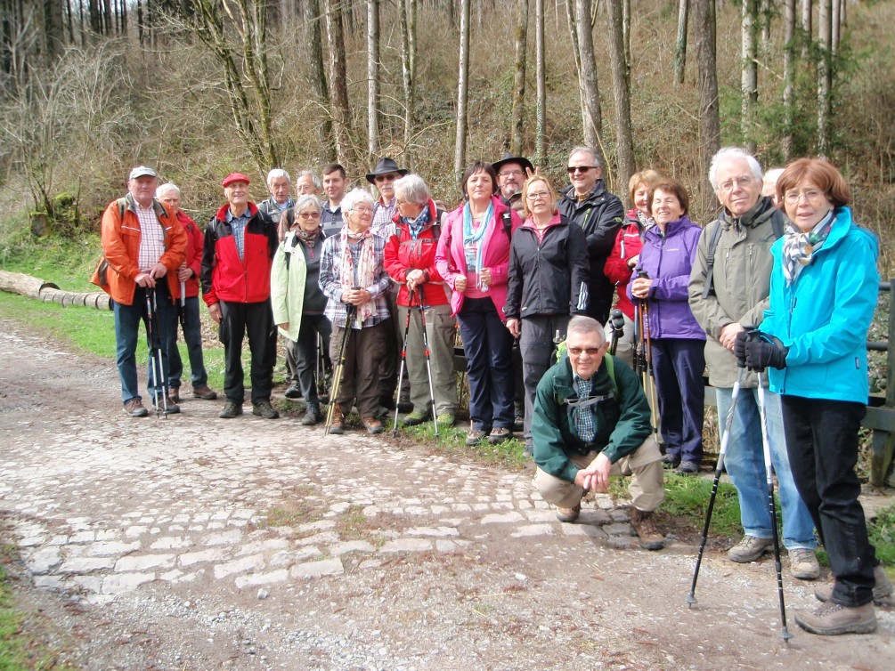 Mit dem Bus erreichte die Wandergruppe rasch Prevorst. Von dort aus führte der Weg zuerst über Wiesen und Waldwege in Richtung Stocksberg. Das Wetter war noch etwas trübe und die Wiesen und Waldwege feucht.