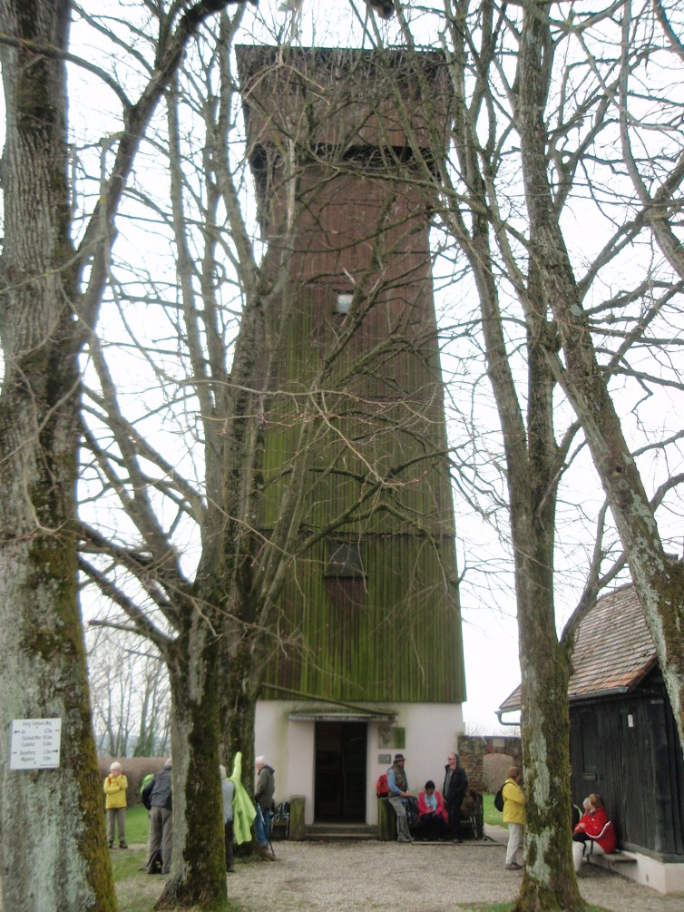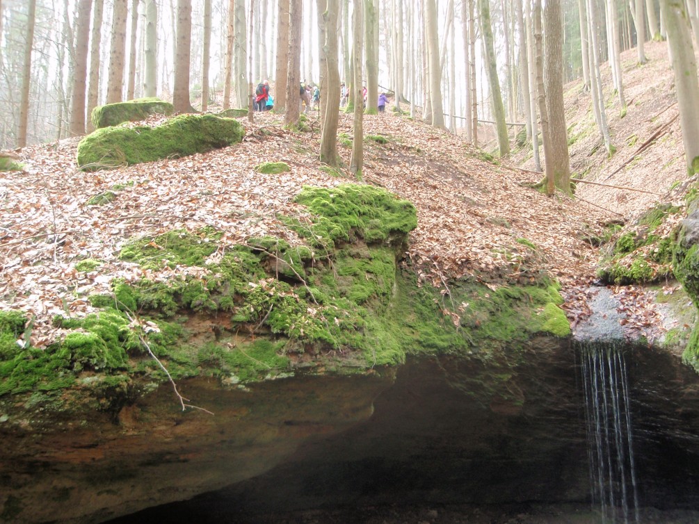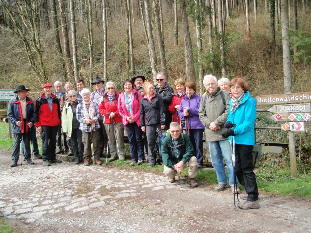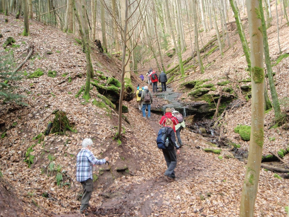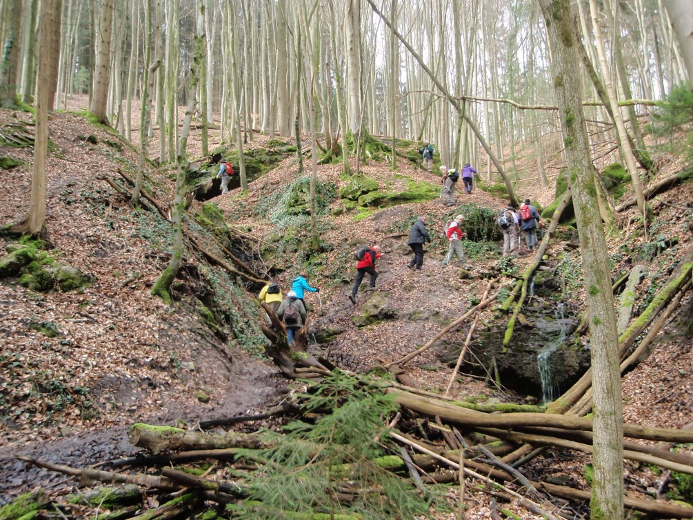 Steil hinauf ging es nun aus dem Tal der Lauter hinauf auf die Höhe. Das nächste Wanderziel war die sehenswerte Hüttlenwaldschlucht. Die tief eingeschnittene Klinge weist zum Teil sehr steile Hänge, seilgesichterte Wegstellen, einen kleinen Wasserfall und höhlenartige Sandsteinstrukturen auf, was den Wanderern einiges an Kondition abverlangte. Weiter bergauf ging der Weg zum 533 m hohen Juxkopf. Der wunderbare Rundblick vom Aussichtsturm über die Löwensteiner Berge und den Murrhardter Wald war der Lohn für die Mühen des Aufstiegs.