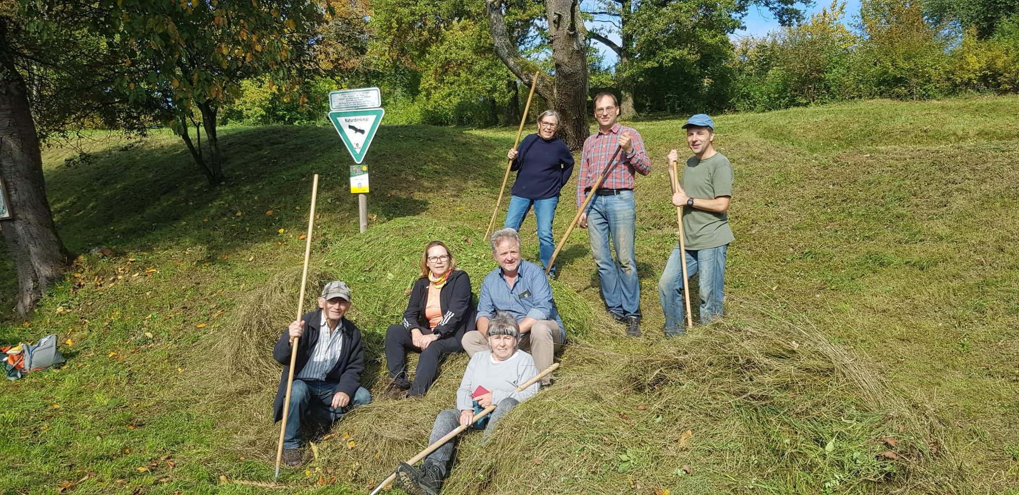 Noch im morgendlichen Nebel begannen fleißige Helfer vom Schwäbischen Albverein Bietigheim-Bissingen und weitere Freiwillige ihren Arbeitseinsatz am Naturdenkmal Hirschberg. Mit Rechen, Gabeln und Transportplanen wurde das gemähte Gras von der Fläche entfernt. Ohne diesen Dünger können dort im kommenden Jahr wieder viele seltene Wildblumenarten erblühen. Für Insekten bilden sie einen reich gedeckten Tisch. Bis die ersten Sonnenstrahlen zu den Helfern durchdrangen waren bereits mehrere große Haufen mit dem Mähgut am Weg aufgeschichtet. Den Abtransport erledigte danach ein örtlicher Landwirt im Auftrag der Stadtgärtnerei.