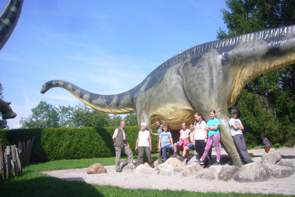 Interessant war für die Gruppe auch der im Außenbereich befindliche Dinosaurierpark. An einem See zwischen Schachtelhalmen, Ginkgo- und Mammutbäumen waren lebensgroße, täuschend echte Dinosaurier des Erdmittelalters zu besichtigen. Hier stärkte sich die Gruppe nun auch mit dem mitgebrachten Vesper. Die Jugendlichen drängten, nun endlich zum nächsten Ziel, dem Schieferbruch in Ohmden zu kommen. Bevor allerdings aufgebrochen wurde, stellten sich alle noch zu einem Gruppenbild unter einem Diplodocus.