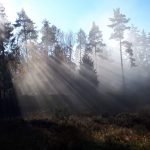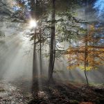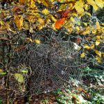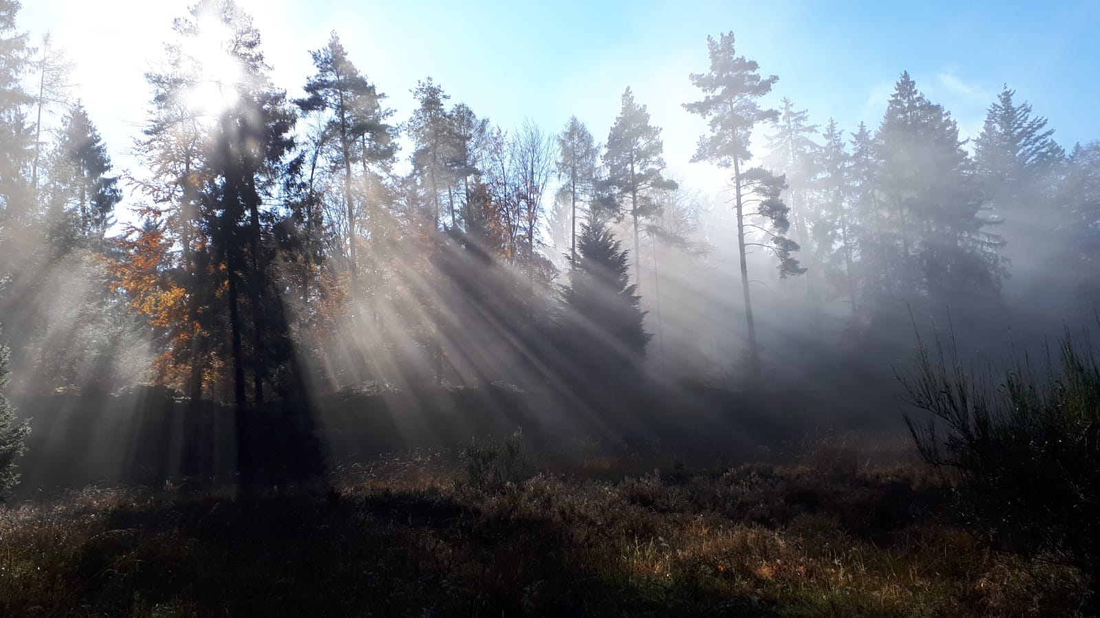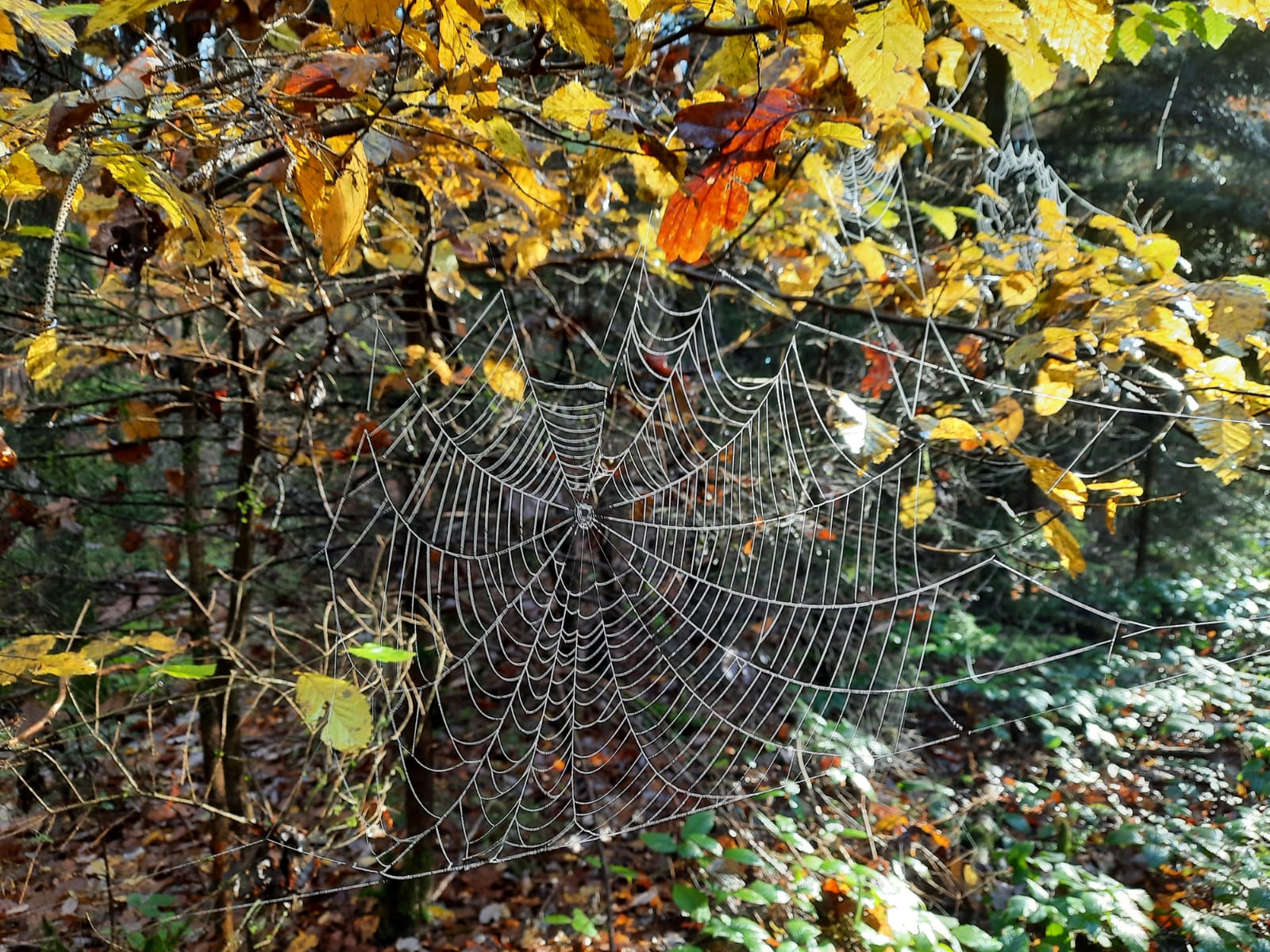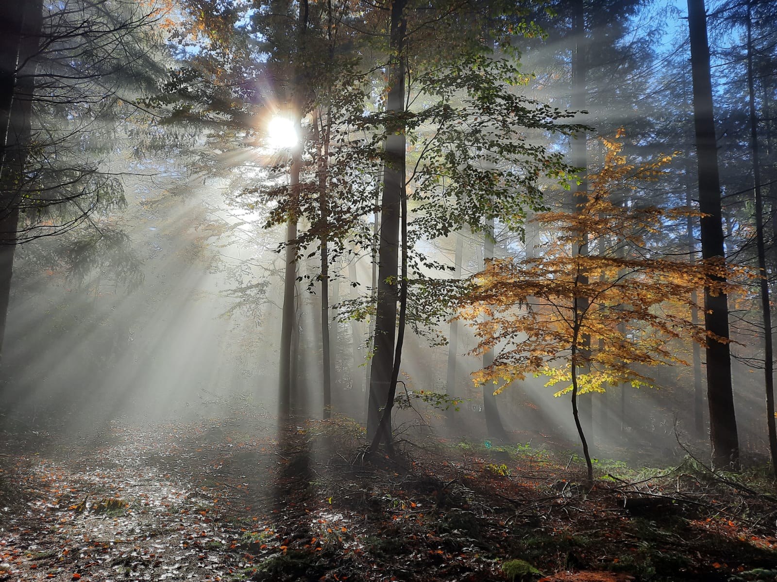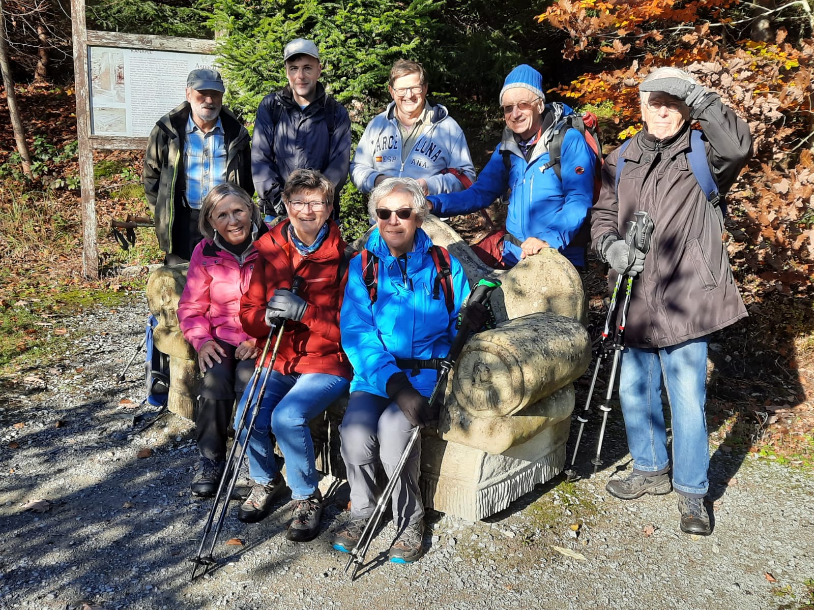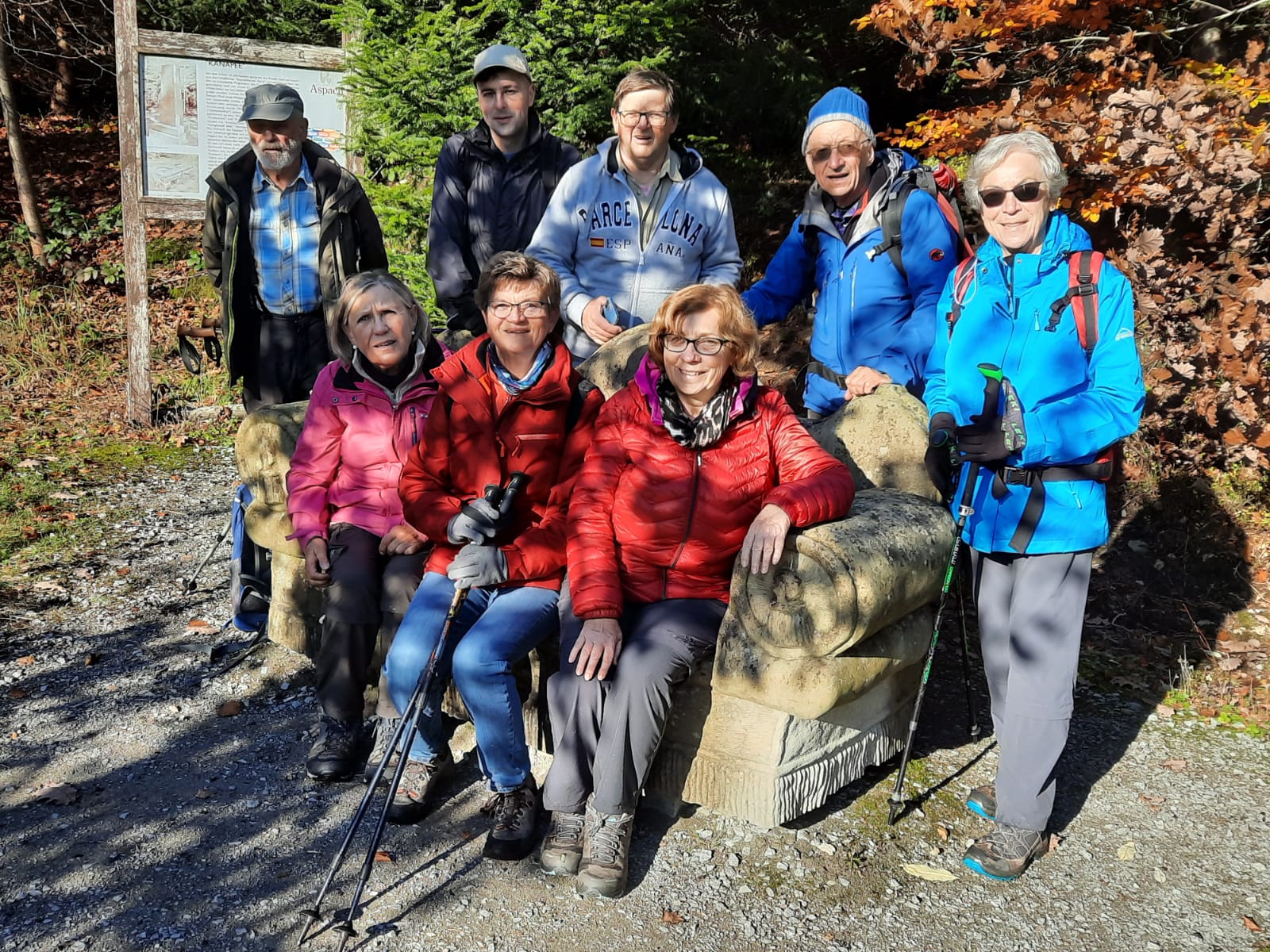 Nach dem Queren der Bundesstraße 14 ging es im Wald steil bergauf, und so wurde es jedem kräftig warm. Bei einem Rastplatz mit Tisch und zwei Bänken machten wir eine Pause. Inzwischen hatte sich der Nebel verzogen und in der Sonne war es schön warm. Bei der weiteren Wanderung leuchtete das Laub golden auf den Bäumen, aber auf dem Waldboden hatte das Gras einen weißen Schimmer vom Raureif.