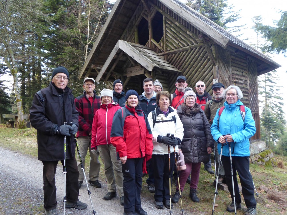 Der weitere Weg führte stets leicht ansteigend zur Sitzbankhütte. Hier wurde nun Rast gehalten. Ausgeruht und gestärkt marschierte die Gruppe über den Höhen des Eyachtals, vorbei am Eselskopf, der Kriegswaldhalde zur Schirmhütte, dem höchsten Punkt der Wanderung. Von dieser bot sich ein Blick auf das über der anderen Talseite sonnenbeschienene Dobel.